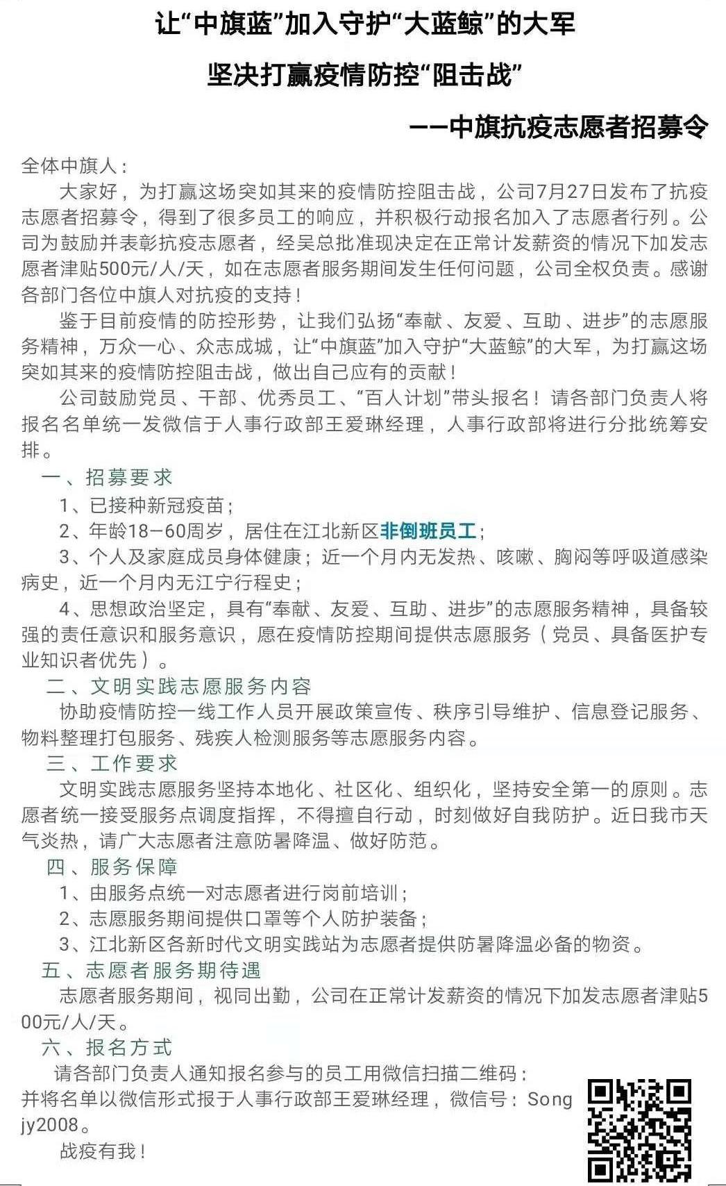 自7月20日南京祿口爆發(fā)新一輪新冠疫情以來,中旗科技立即行動組織全員應對這場防疫攻堅戰(zhàn)。根據(jù)政府防疫布控要求,嚴格落實各項防疫防控措施。確保每位員工做好個人防護、定時定點核酸檢測。公司還于7月27日、29日兩度發(fā)布中旗科技“抗疫志愿者招募令”,倡議符合條件的員工,尤其是黨員、干部、優(yōu)秀員工、“百人計劃”積極報名,志愿加入江北新區(qū)疫情防控一線工作中,協(xié)助開展政策宣傳、秩序引導、檢測協(xié)助等社會防疫活動。通知一經(jīng)發(fā)布,得到了中旗員工廣泛響應和積極報名。